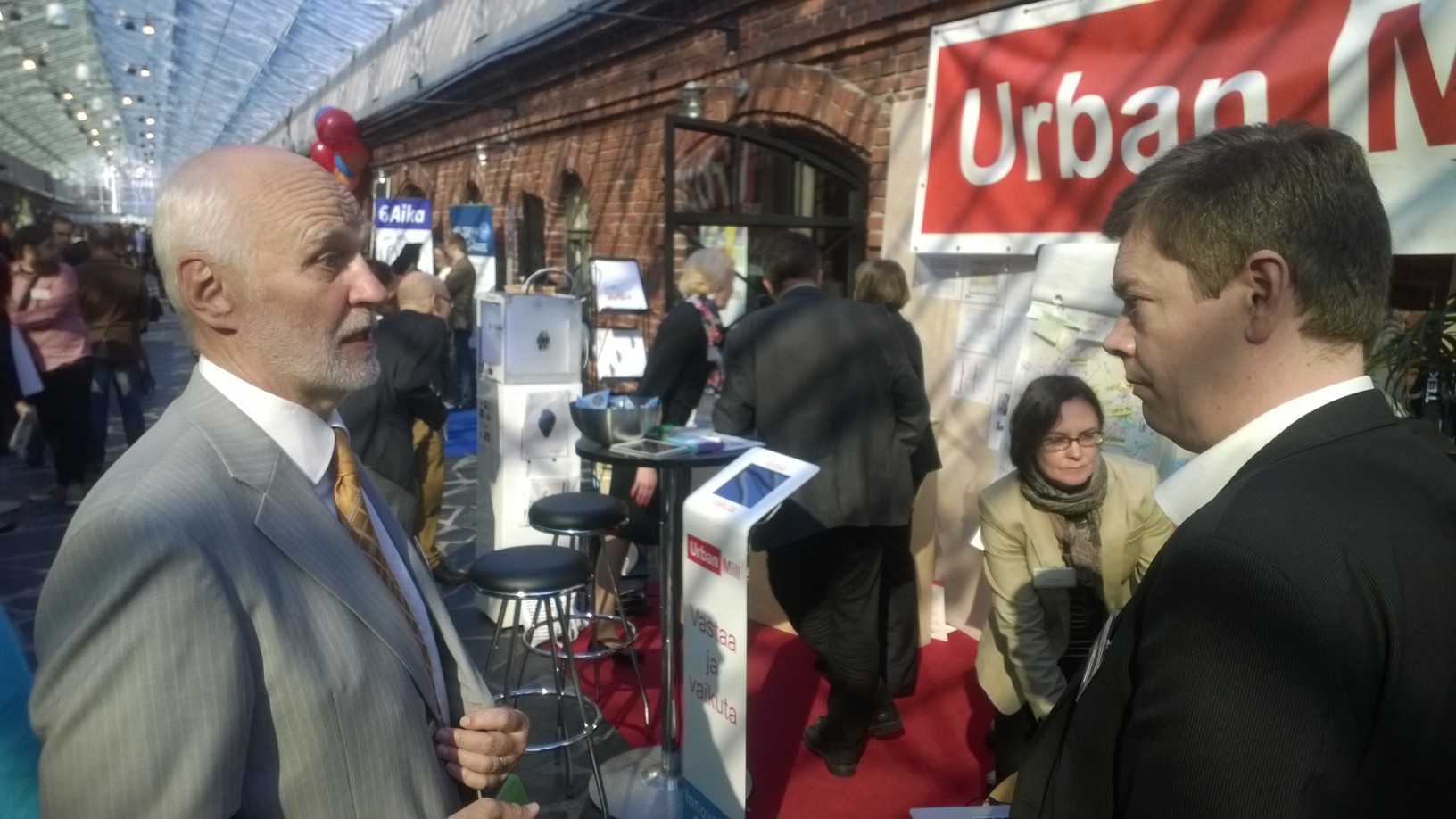 Suomen julkisen avoimen tiedon Grand-old-man Antti Rainio Navinova Oy:sta pohti Urban Millin ständillä Adminotech Oy:n Tommi Hollströmin kanssa virtuaalisten avointen 3D-yhteistyöalustojen roolia innovaatiotoiminnan työkaluna.