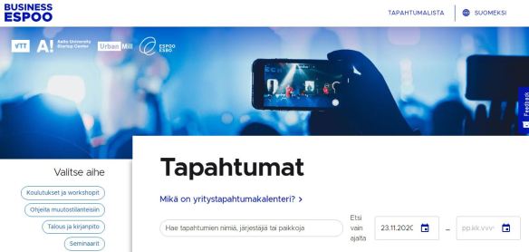 Espoossa testataan uutta digitaalista tapahtumakalenteria, joka kokoaa yhteen alueen yrityksille, yrittäjille ja yrittäjyyttä suunnitteleville suunnattujen tapahtumien ja koulutusten tiedot. Kalenterissa on tietoja sekä fyysisistä että virtuaalisista verkostoitumistapahtumista, yrittäjyyskoulutuksista, tiettyyn teemaan tai alaan liittyvistä seminaareista ja esimerkiksi kasvu- ja kiihdyttämöohjelmien hakuajoista.